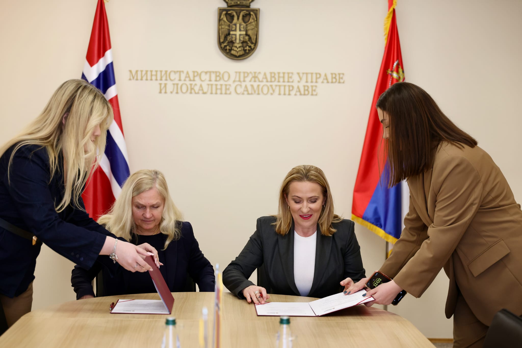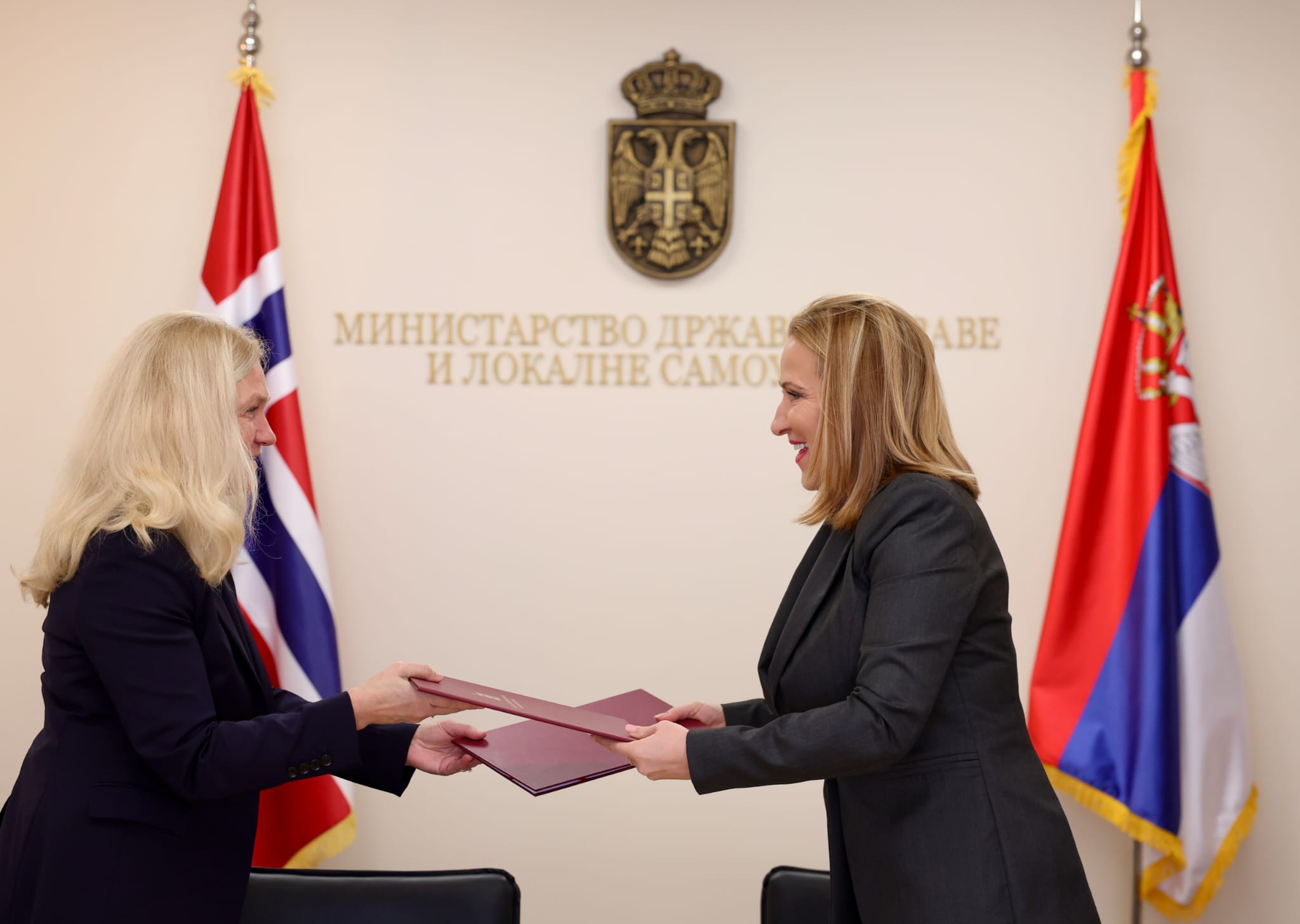 Министарка државне управе и локалне самоуправе Снежана Пауновић и амбасадорка Краљевине Норвешке у Србији Кристин Мелсом потписале су данас Меморандум о сарадњи којим се успоставља оквир за спровођење специјализованог развојног програма обуке у области одбране – МОД Академије.